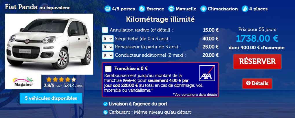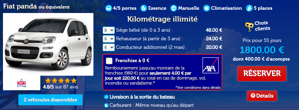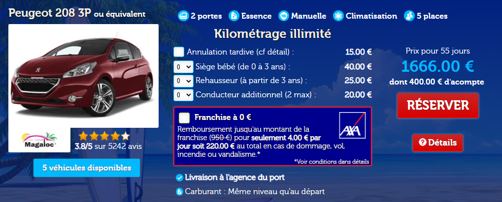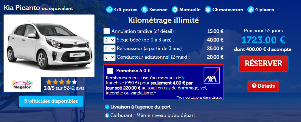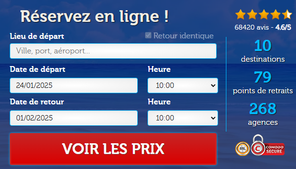 Il faut souligner que ces tarifs sont donnés à titre indicatif et peuvent varier en fonction de la destination, du loueur et de la période de location. N’oubliez pas que Rentîles propose également des options supplémentaires comme l’assurance rachat de franchise, qui peut s’avérer judicieuse pour voyager l’esprit tranquille. Pour effectuer une réservation, il suffit de se rendre sur le site internet est de remplir le formulaire de réservation :